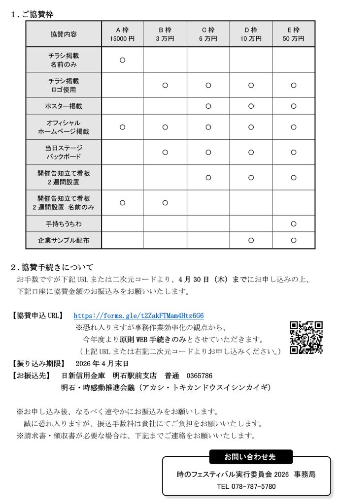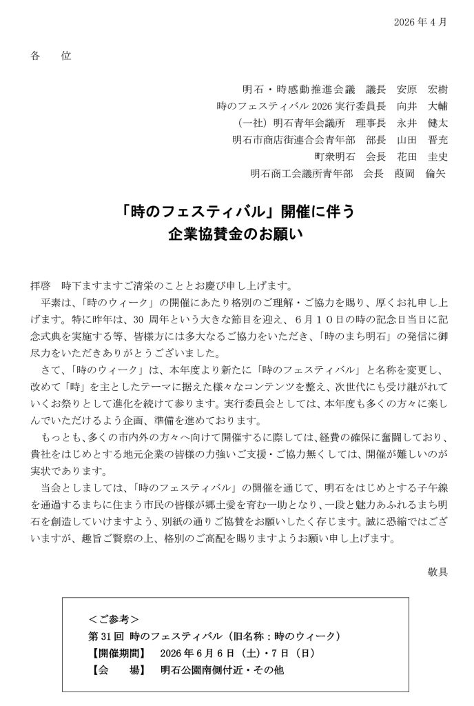 2026年4月9日 / 最終更新日時 : 2026年4月9日 akashi135 お知らせ 「時のフェスティバル2026」ご協賛のお願いについて WEBでお申し込みの方はこちら FAXでお申し込みの方は下記ボタンより申込用紙をダウンロードください FAXでお申し込みの方はこちら